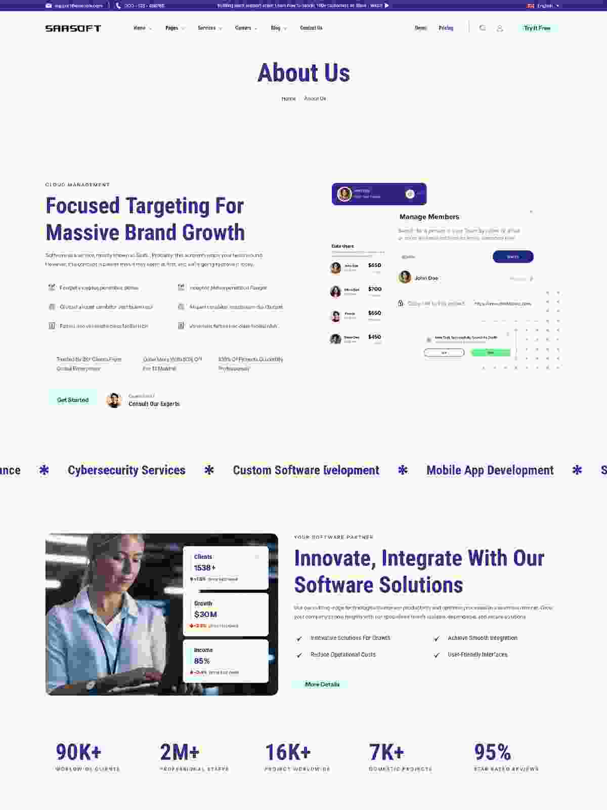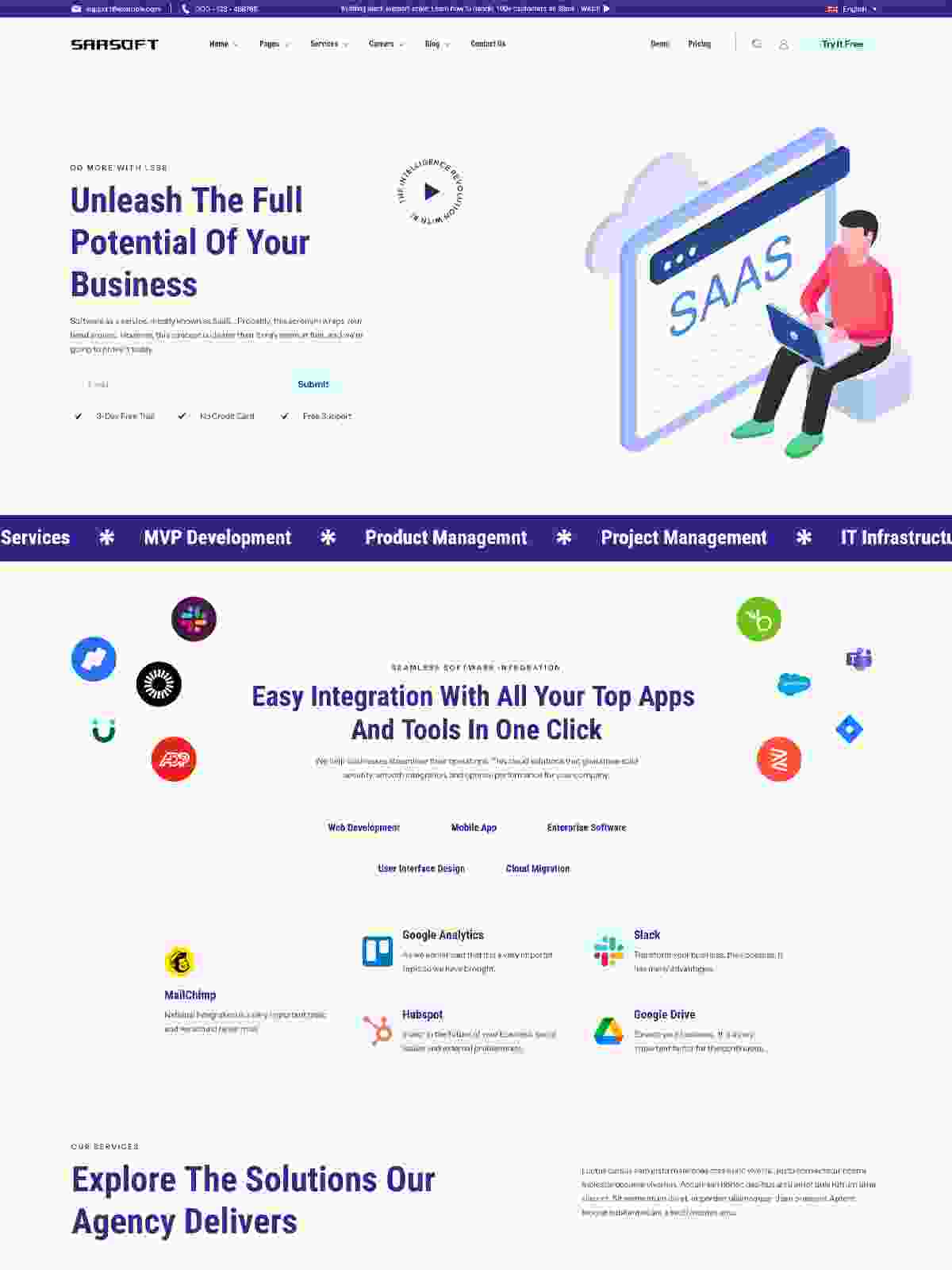 SaaSoft – is an App, SaaS & Software Startup Website WordPress. Best for Finance Consultant Business, Creative SaaS, Language Learning Websites, Project Management Studio, Help Desk Solutions, Corporate Agency, Green Tech Products Shop, Live Chat App Software Promotions, SEO, Social Media & Digital Marketing Business It gives you the ultimate design freedom with advanced art board options all Modern Technology Company and Software Development Website Design.